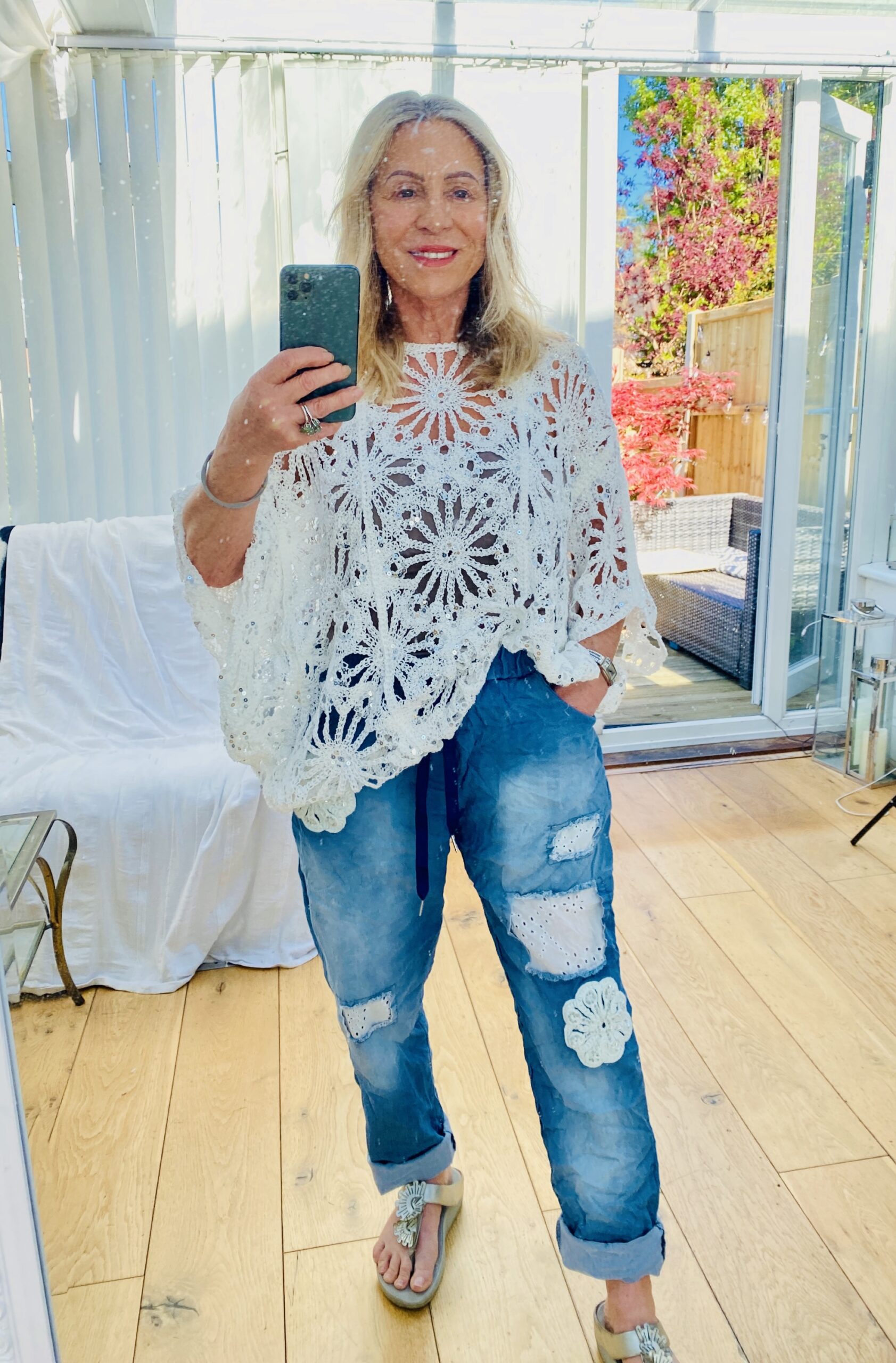 Beautiful light weight stretch jeans with crochet embroidery flowers fit size 10 to 16