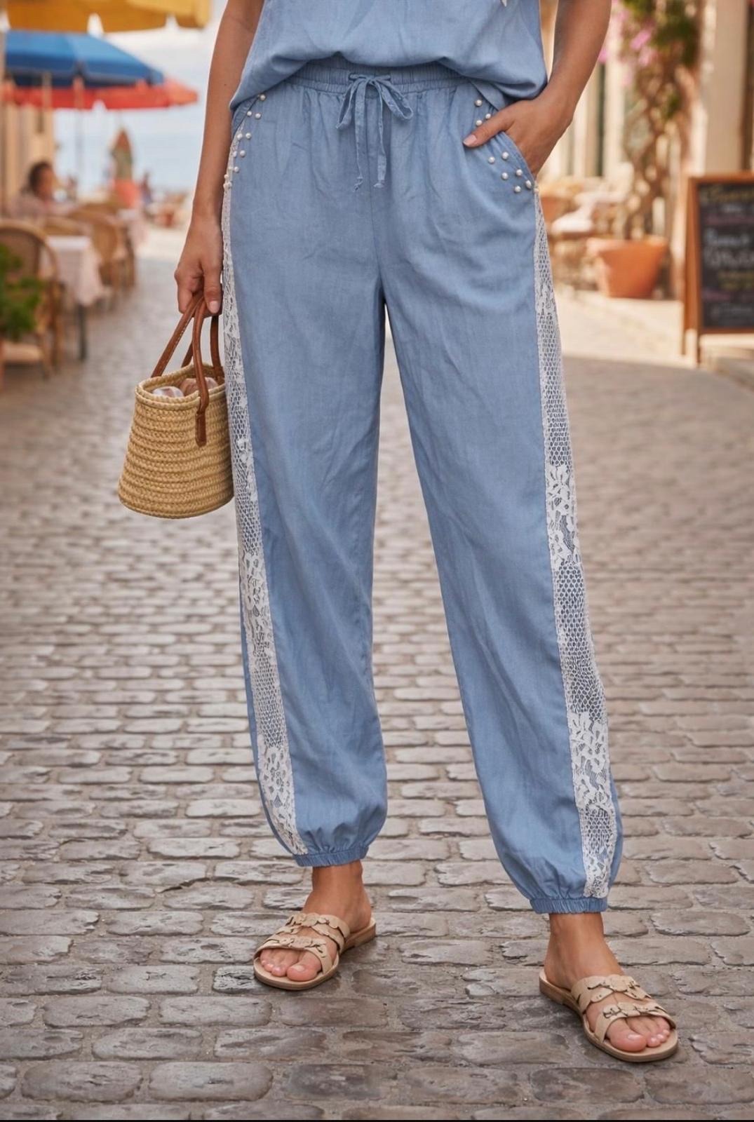 This is a light denim look soft material do ord featuring a draw string waist, pearl detail around the edges and lace pocket