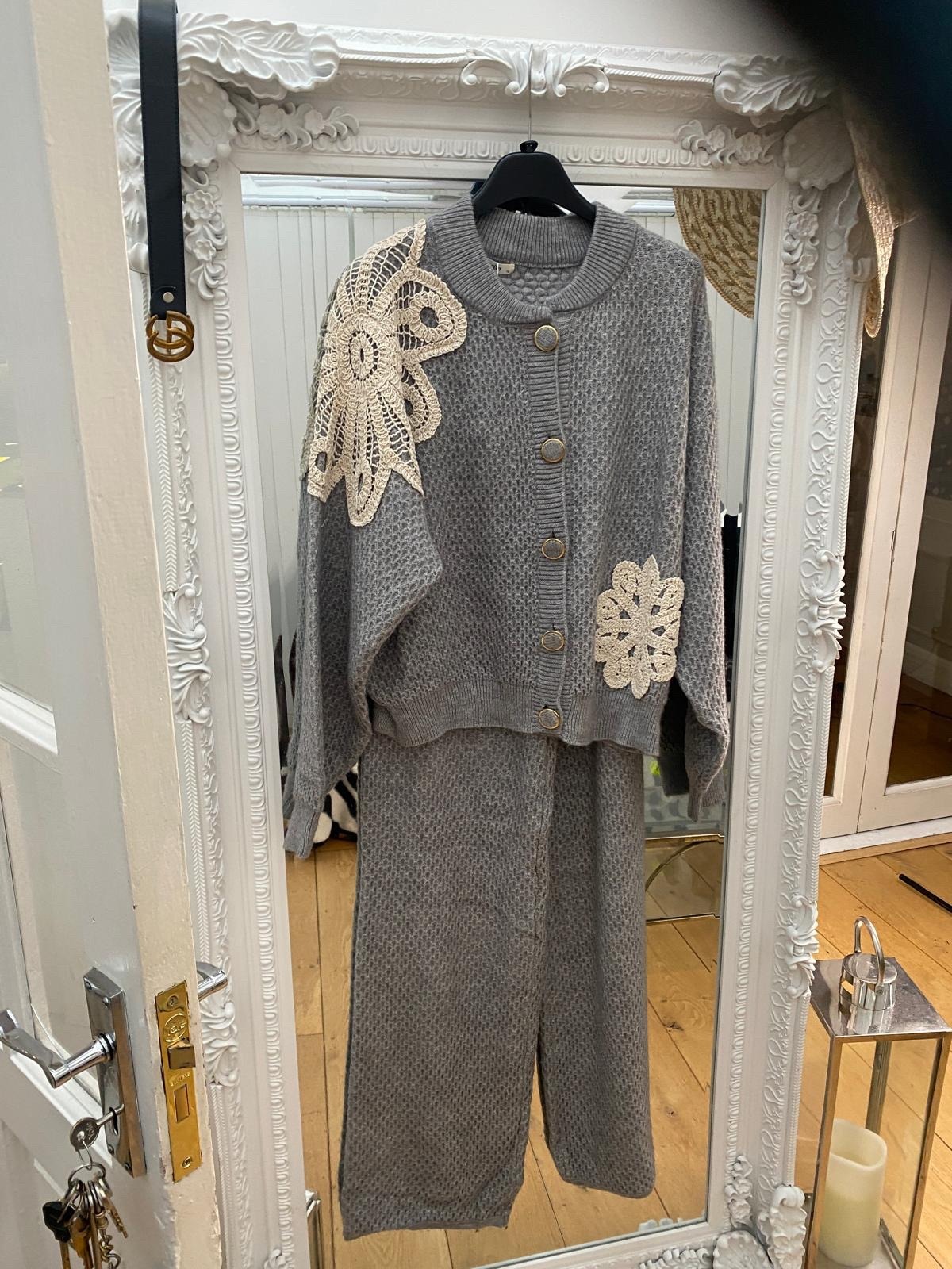 A grey knit 2 piece with flower design